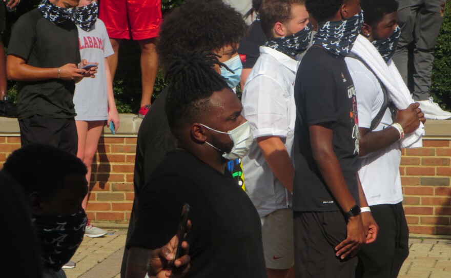 Players and coaches for the Alabama Crimson Tide made their feelings known about the Black Lives Matter movement. The team marched to Foster Auditorium at the University of Alabama to address students and faculty on racial justice. Foster is the location of the so called “stand in the schoolhouse door” where Governor George Wallace tried to keep two African American students from enrolling in 1963.The list of speakers included Tide players Chris Owens and Jarez Parks*. They were joined by Doctor Christine Taylor. She’s the University’s Vice President for Diversity, Equity, and Inclusion. APR’s Pat Duggins attended the march and put together this sound portrait.
